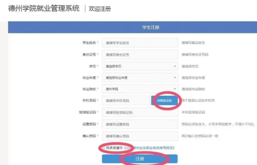 (3)填入栏目中全部准确信息,获取“短信验证码”后输入,选择“我承诺遵守”,点击“注册”按钮。