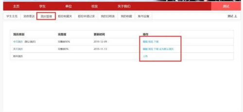 学生完善简历:学生登录后,可在线制作简历(中文简历、英文简历),也可以直接上传附件简历。