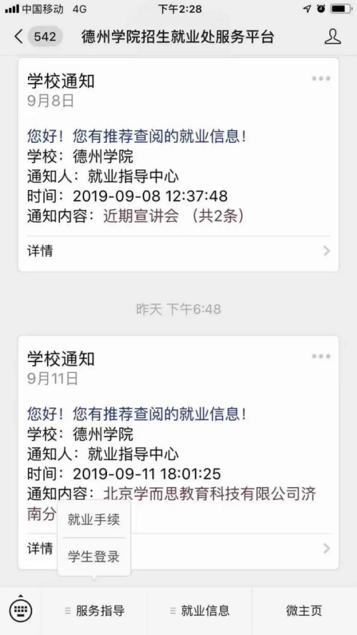 2.进入服务公众号后点击“服务指导”——“学生登录”