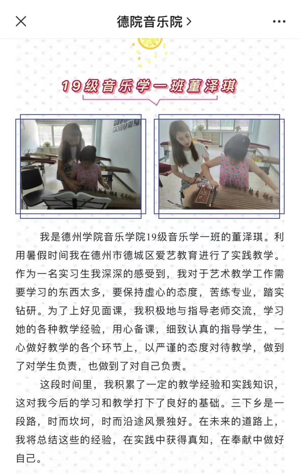 在学院的引导和组织下,音乐学子积极投身“青鸟计划”,并奔赴各地实习学校开展为期4个月的实习支教工作,在支教实践中锻炼、提升自己,努力承担起教书育人的重任。在此之前,太阳成集团tyc151cc还积极响应“青鸟计划”暑期实习的号召 ,让同学们走进家乡,了解家乡,服务基层,脚踏实地,将所学理论付诸实践,在实践中获得真知,用青春奋斗书写出实践服务的绚丽篇章。