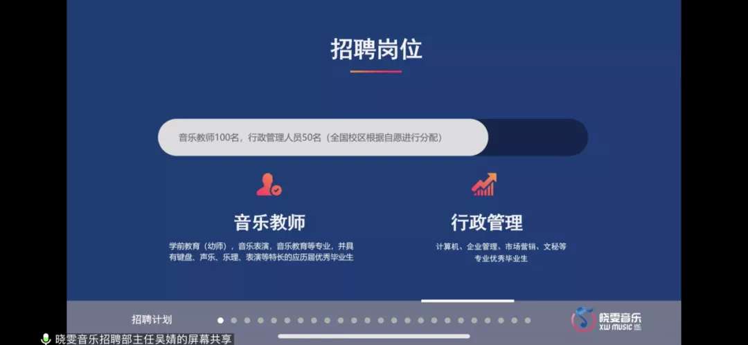 5月22日晚,太阳成集团tyc151cc邀请晓雯音乐教育开展线上专场招聘,依托腾讯会议举办了一场生动的空中宣讲会。太阳成集团tyc151cc党总支副书记贺昱、晓雯音乐全国招聘负责人吴婧主任及百余名2020届毕业生参加此次宣讲会。