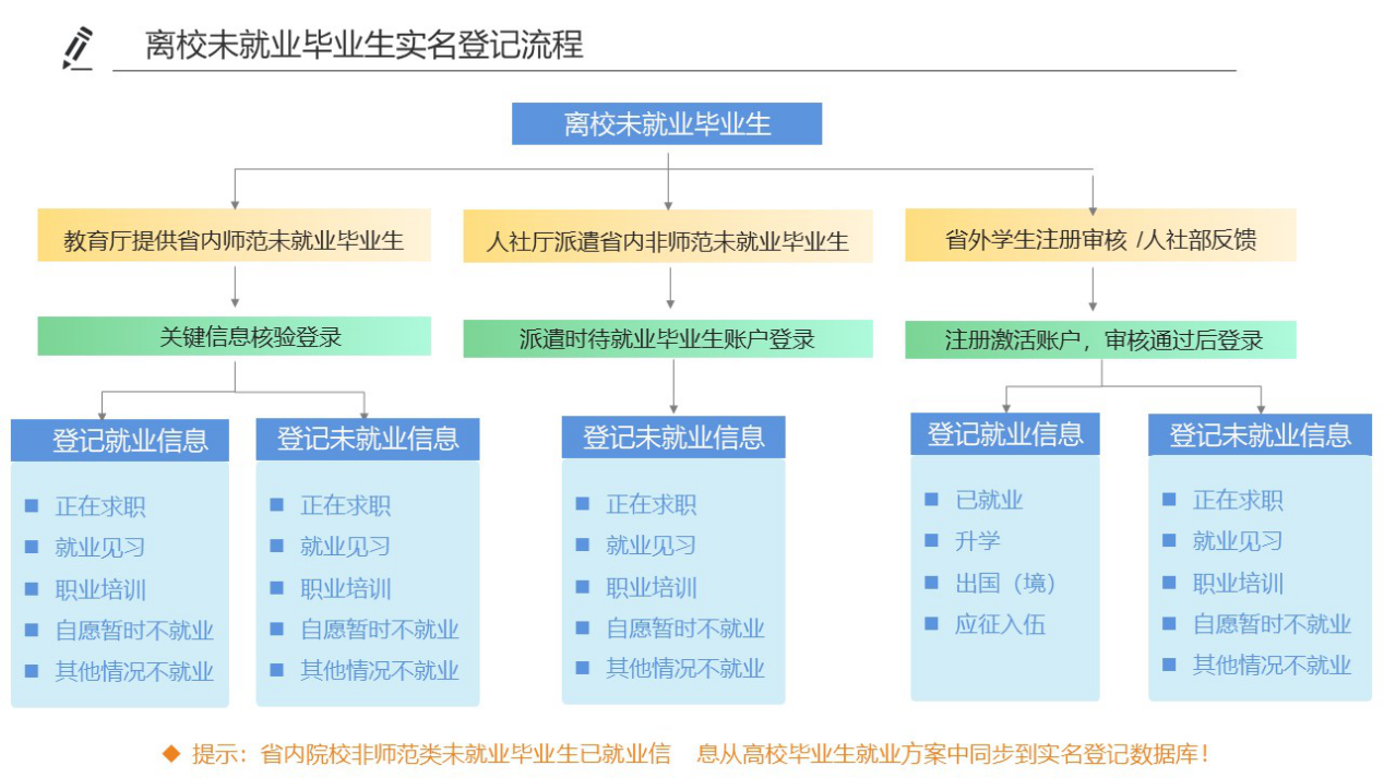 实现山东户籍离校未就业毕业生实名登记功能,登记就业、升学、出国、应征入伍以及未就业毕业生服务需求信息。 包括省内院校非师范毕业生、省内院校师范类毕业生和省外院校毕业生三类。